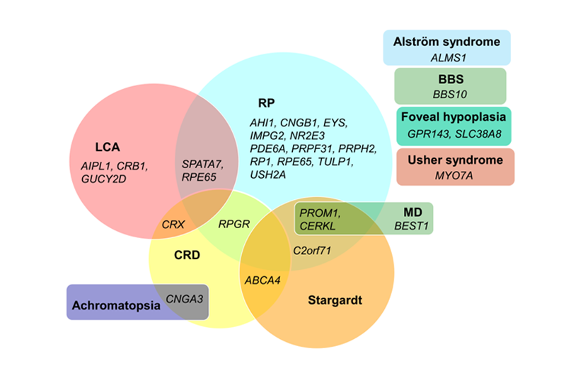Figure: Phenotype-genotype overlap as observed in a cohort of Indian IRD patients (2014-2019) as identified at the Gen-Eye clinic at Narayana Netralaya. Gopinath C et.al. Inherited retinal disorders: a genotype-phenotype correlation in an Indian cohort and the importance of genetic testing and genetic counselling. Graefes Arch Clin Exp Ophthalmol. 2023 Jan 17