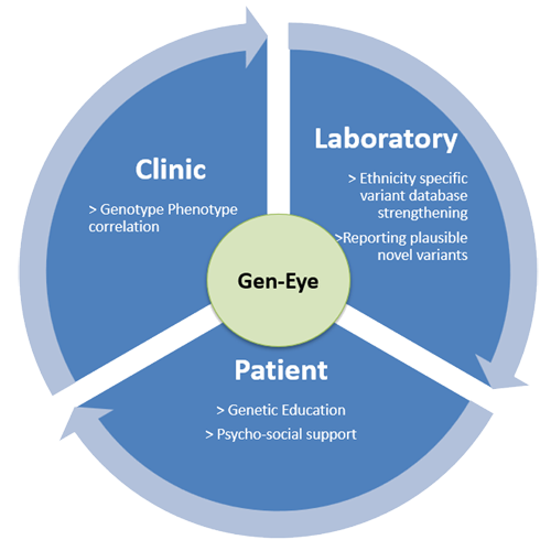 The Gen-Eye clinic has been running since 2014. It has been a liaison between the clinics, patients and the laboratory-genetic-counsellors at Narayana Netralaya. Through the years at Gen-Eye clinic we have generated a significant database that includes family history, clinical and genetic data of patients with ocular genetic disorders. This has enabled us to understand the demographics, frequency of genetic disorders, the causative variants, inheritance patterns in the context of the Indian ethnicity. All the information from Gen-Eye in collaboration with the clinics has led to effective phenotype-genotype correlations.